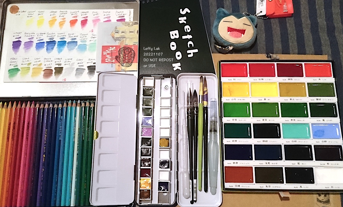 小黑盒是Daniel Smith水彩組,不過裡面也有別牌的。大綠盒是吳竹顏彩,做打底、試色、草稿、初學很好用。但如果你是要著重疊色效果、漸層效果、濕水或其他傳統透明水彩技法的,就還是得用DS那盒,或等級差不多的系列。