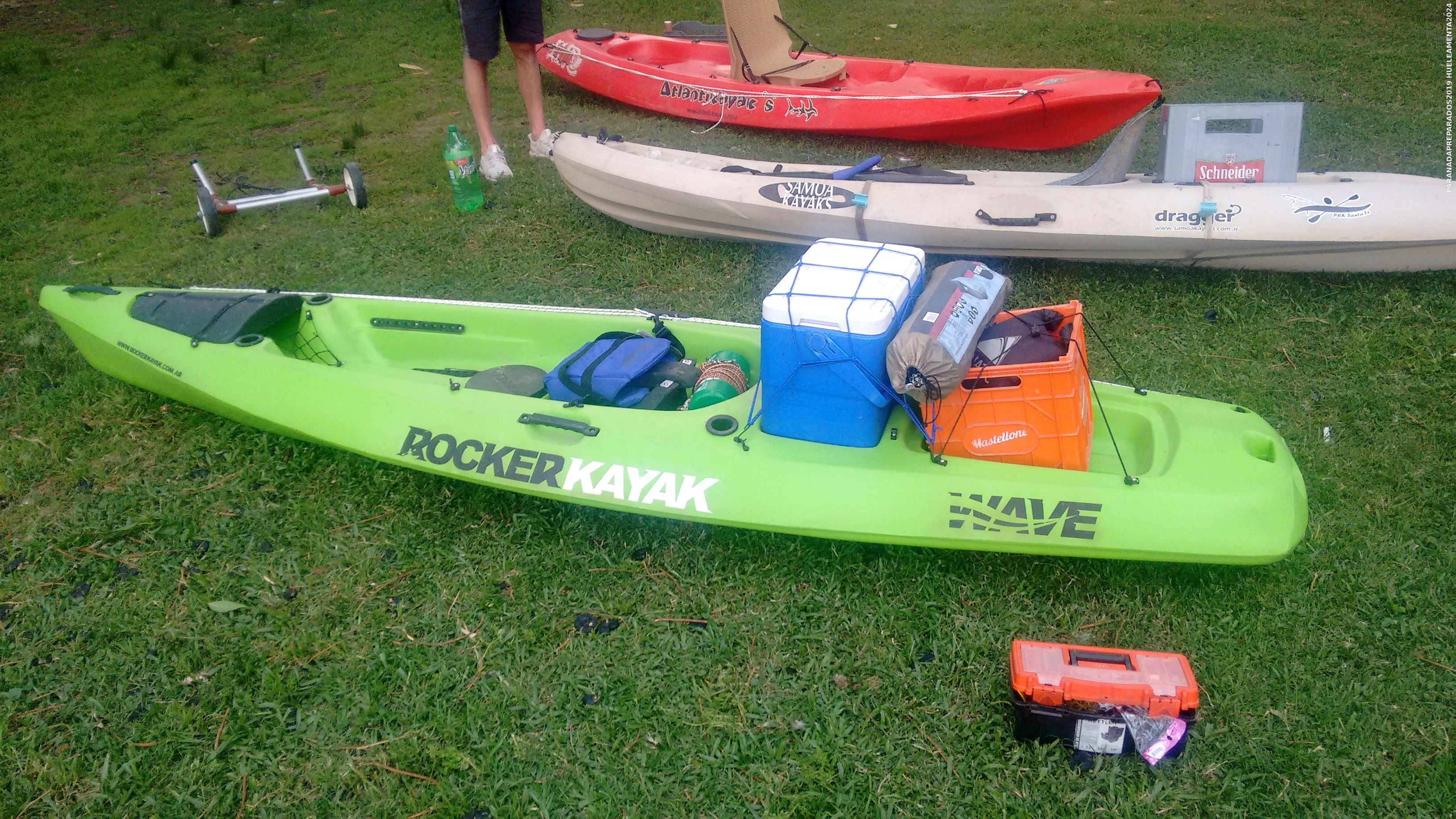Por ahí hay fotos, hay un videito o dos de los primeros dos kayaks que llegan. Los llevamos con la camioneta de Mario. Mario también nos hizo la gauchada, con la Mili, los llevamos al campo y los… primera vez que nos subíamos a un kayak. Los tiramos al agua y ahí debutamos, lo que es un kayak. Así que ahí arranca la cuestión. Ya teníamos dos kayaks, después compramos uno más y otro más, bueno: los cuatro kayaks.