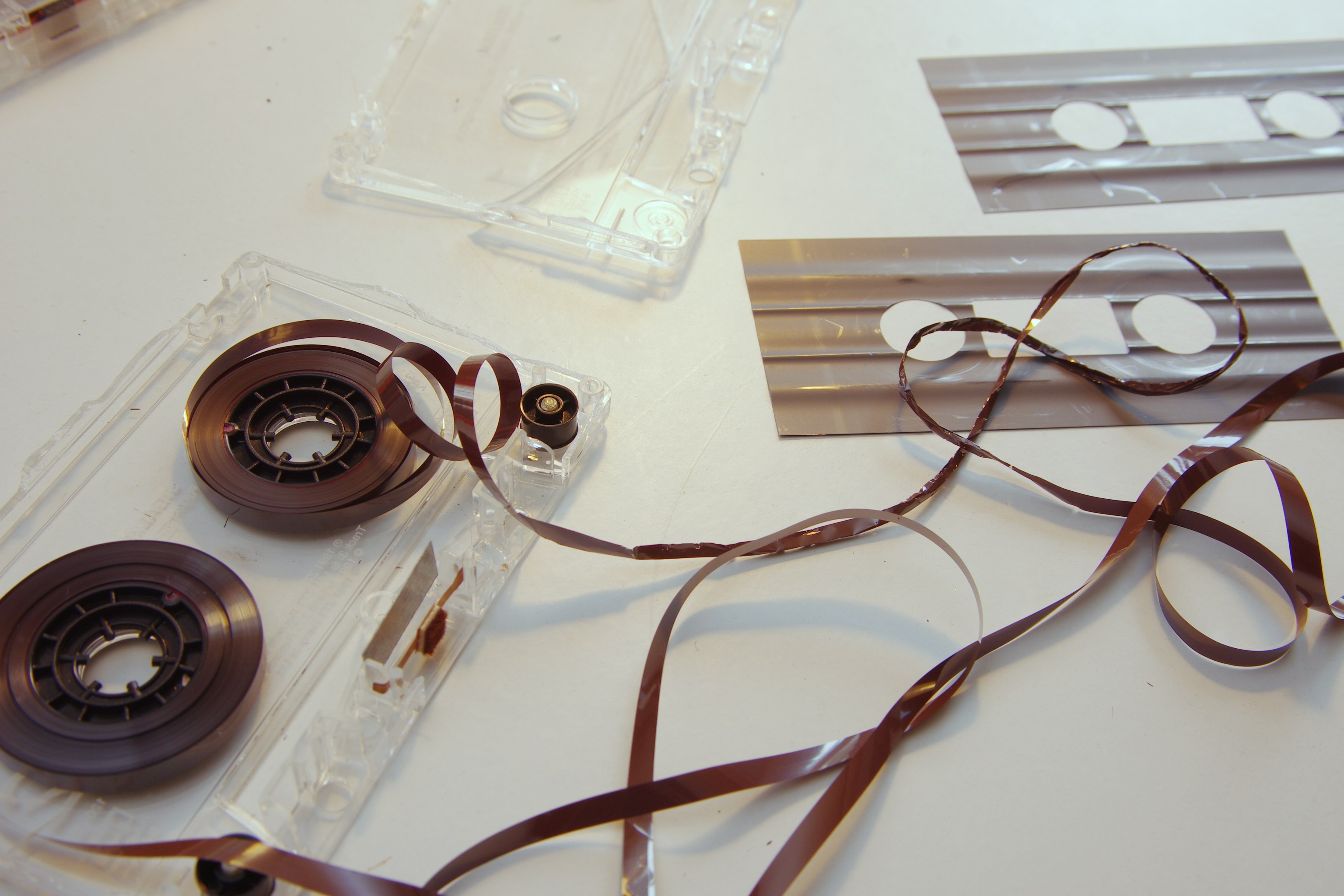Lo primero que hice fue intentar abrirla. Las cassetes originales de los 90’s normalmente no tenían tornillos y al ser tan antigua el plástico estaba ya quebradizo… de modo que tenía preparada otra cinta para canibalizar su carcasa, una JVC de 60 min.