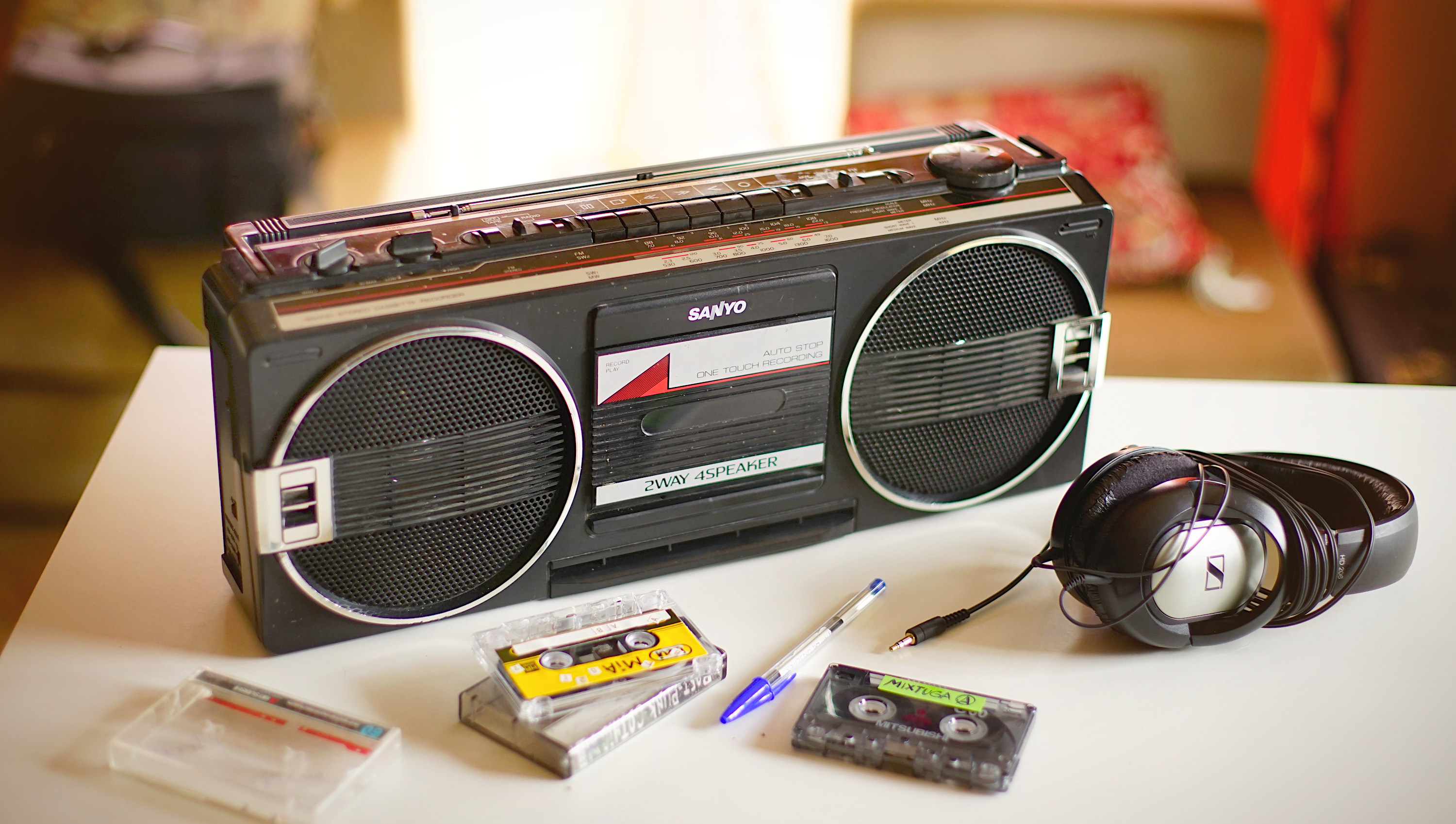 Aquella radiocassette me acompaño durante unos buenos años (aunque no recuerdo exactamente cuando) creo que fue entre 1989 y 1992. El modelo es de finales de los 80. Tiene una pletina de cassette, radio de 4 bandas (FM, MW, SW1 y SW2) recuerdo que pasaba horas sintonizando y grabando música y sonidos de canales de radio de otros países, era todo un acontecimiento. También era la radio que usaba para grabar encima de cintas originales que encontraba por ahí o que nadie quería. Hacía mis “mixtapes” grabando de la radio, entonces los llamaba “recopilaciones” de música revuelta y sobretodo me encantaba la música instrumental y bandas sonoras de cine que escuchaba mientras dibujaba. Lo que aguantó este aparto no lo aguantaría ningún trasto moderno. La usaba con los amigos para ambientar con música de miedo el “Pasaje del terror” (y le cayó agua encima varias veces). Le compré pilas (usa 6 de las gordas) y nos íbamos al campo o a las cabañas con ella. Al final acabó un poco destrozada, sin la tapa del cassette y echa polvo, pero funcionó hasta el último día. Probablemente cuando me compraron aquella otra Sanyo con doble pletina, más potencia, sorround, ecualizador…